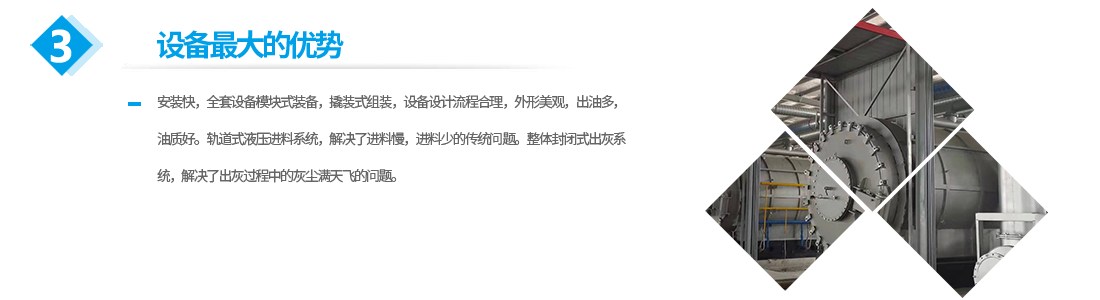 公司生產(chǎn)的設(shè)備的優(yōu)勢:安裝快,全套設(shè)備模塊式裝備,撬裝式組裝,設(shè)備設(shè)計(jì)流程合理,外形美觀,出油多,油質(zhì)好。軌道式液壓進(jìn)料系統(tǒng),解決了進(jìn)料慢,進(jìn)料少的傳統(tǒng)問題。整體封閉式出灰系統(tǒng),解決了出灰過程中的灰塵滿天飛的問題。